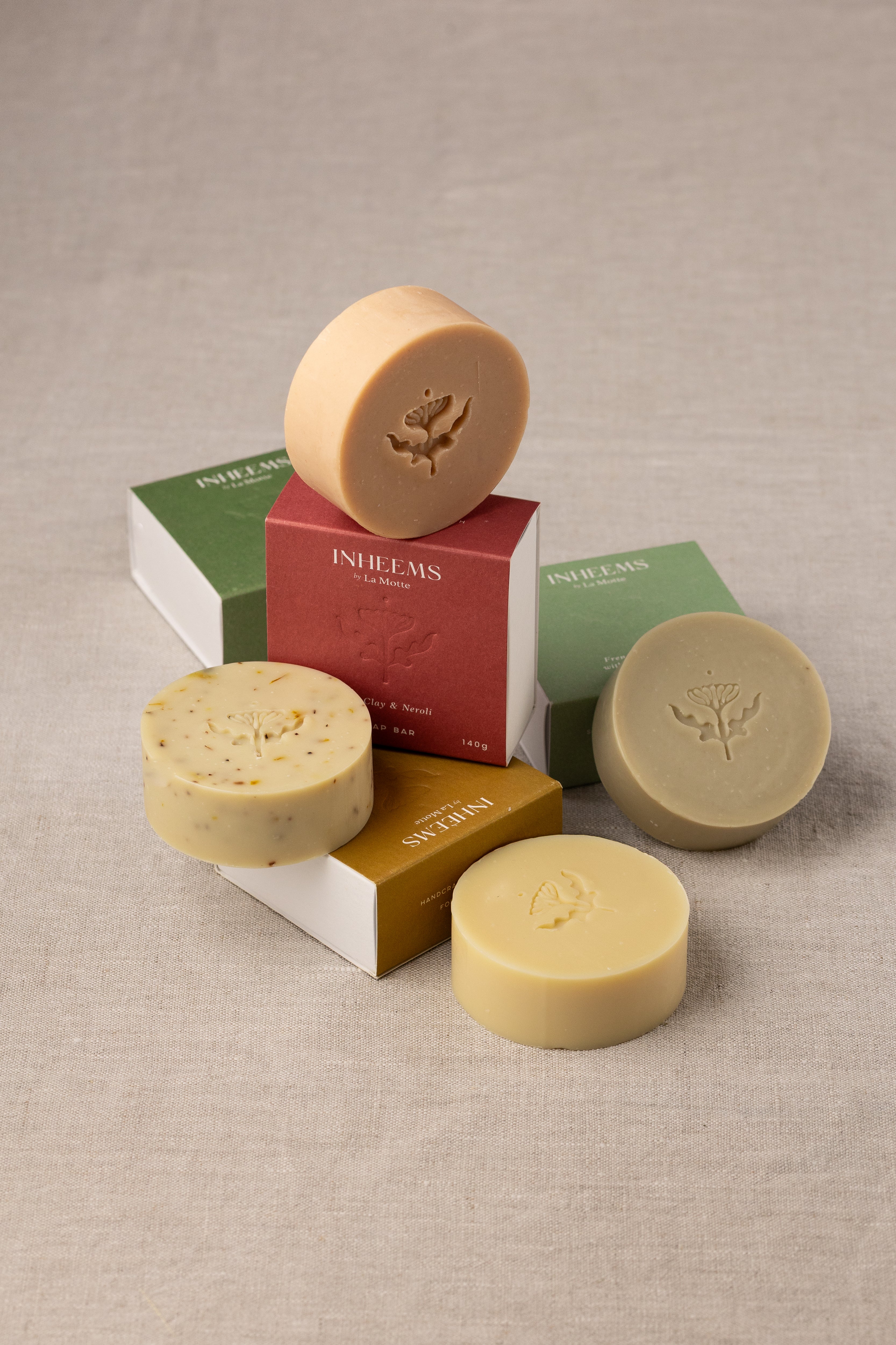 La Motte Inheems Soap Bars R 150.00 Made with 100% natural plant-based products. Using the traditional cold-process method of soap making. The main ingredient is locally grown olive oil which creates a mild and gentle skin nourishing soap. Four fragrances: Farm LavenderCalendula and Farm GeraniumRed Clay and NeroliFresh Green Clay with Farm Geranium