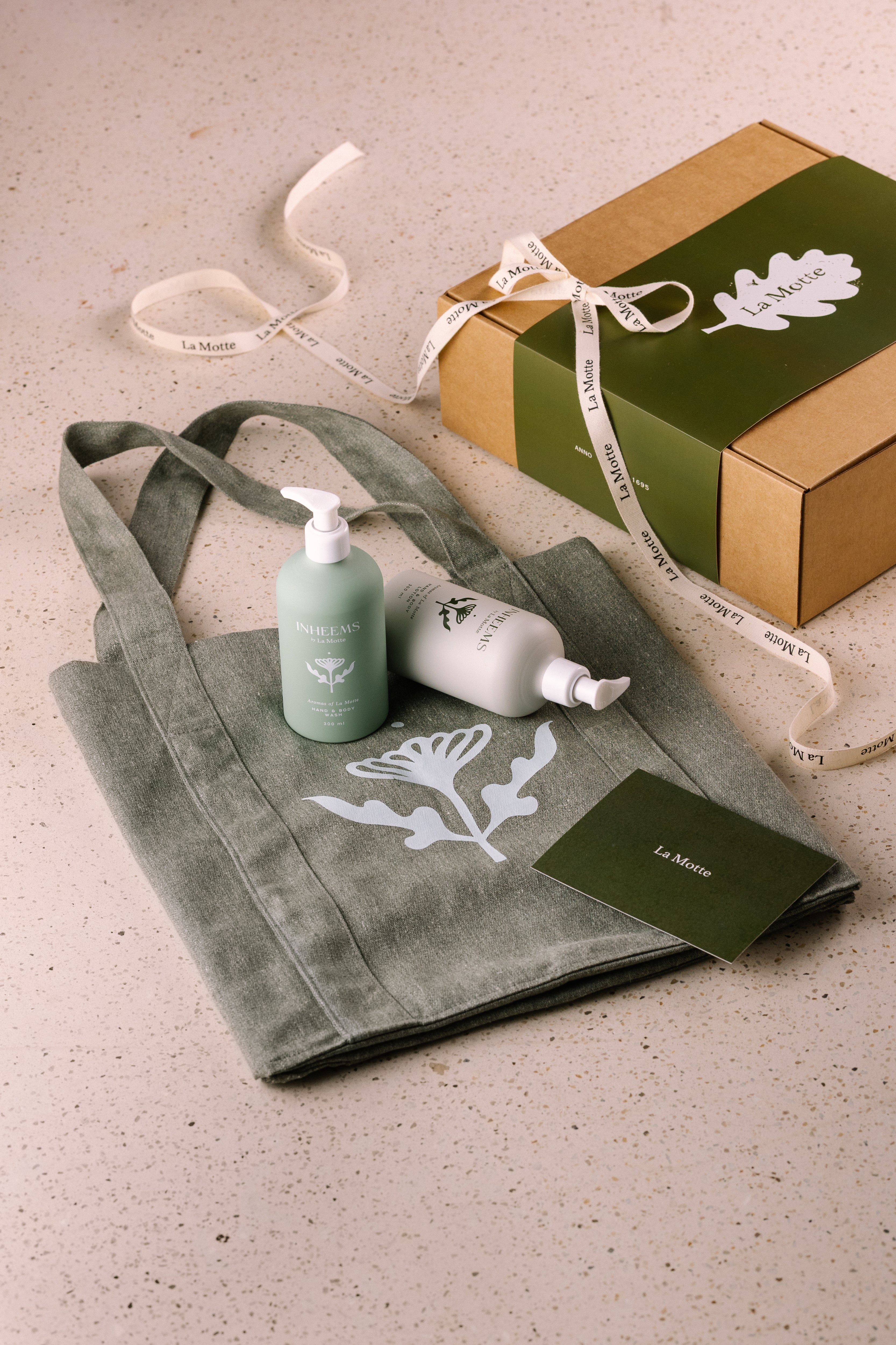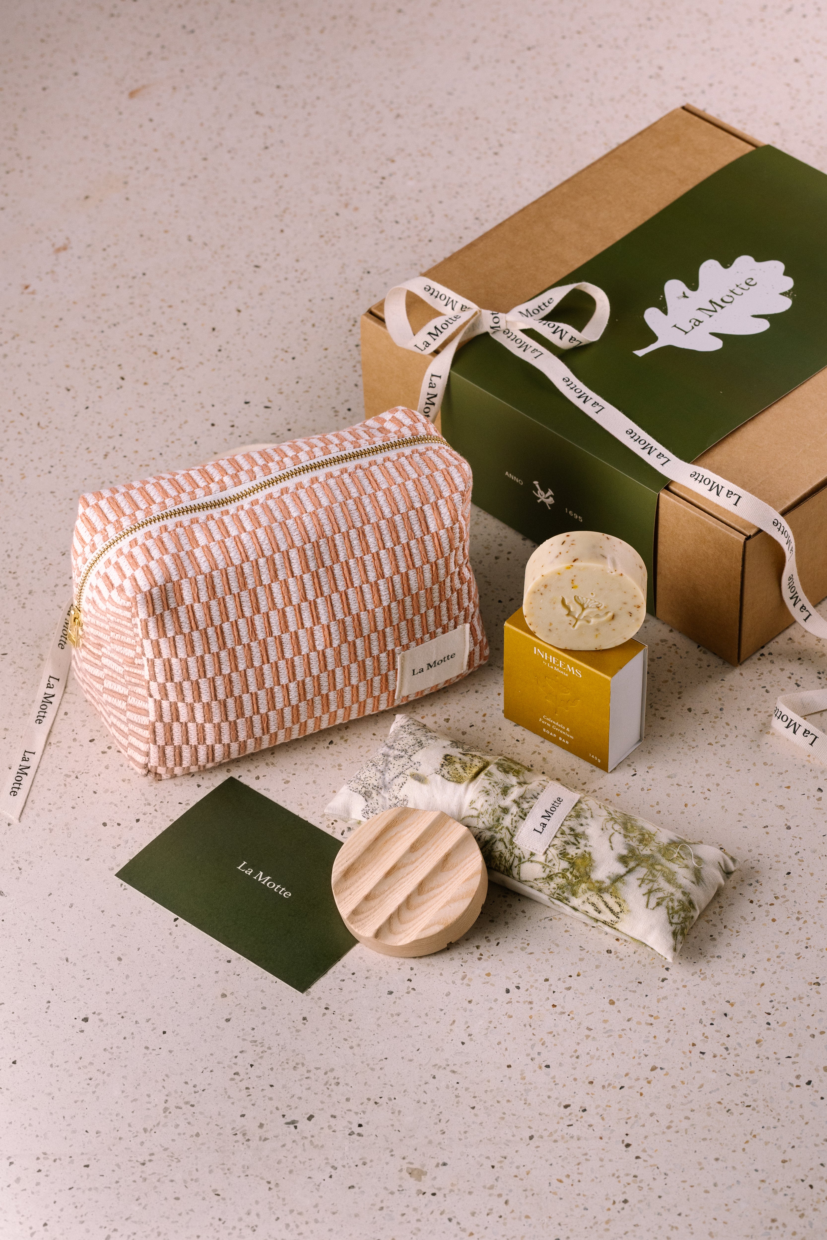 La Motte Tender Loving Care R1,290.00 The ultimate treat for someone who need a little TLC! Elegant cosmetic bag with a round, wooden soap dish, matching Inheems soap bar inspired by the fynbos on the estate as well as the most calming botanical eye pillow. Beautifully packaged with a card to sign