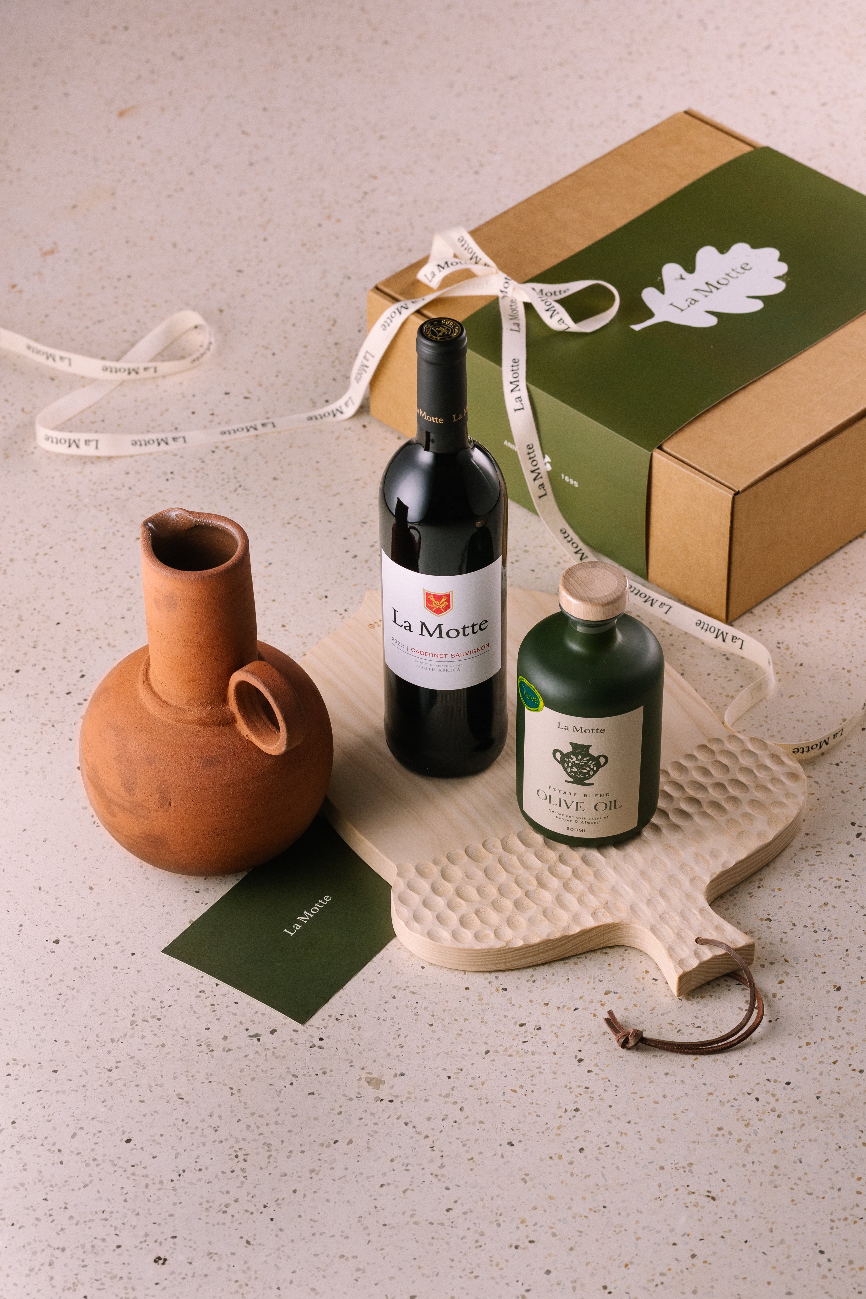 La Motte The Main Event R2,330.00 All that is needed for a spectacular setting! Includes a beautiful The Ryan jug in white or terracotta, a bottle of La Motte Reserve Cabernet Sauvignon, a 500 ml bottle of La Motte’s maiden vintage Extra Virgin Olive Oil, an acorn-shaped cheese board with subtle La Motte branding. Beautifully packaged with a card to sign.
