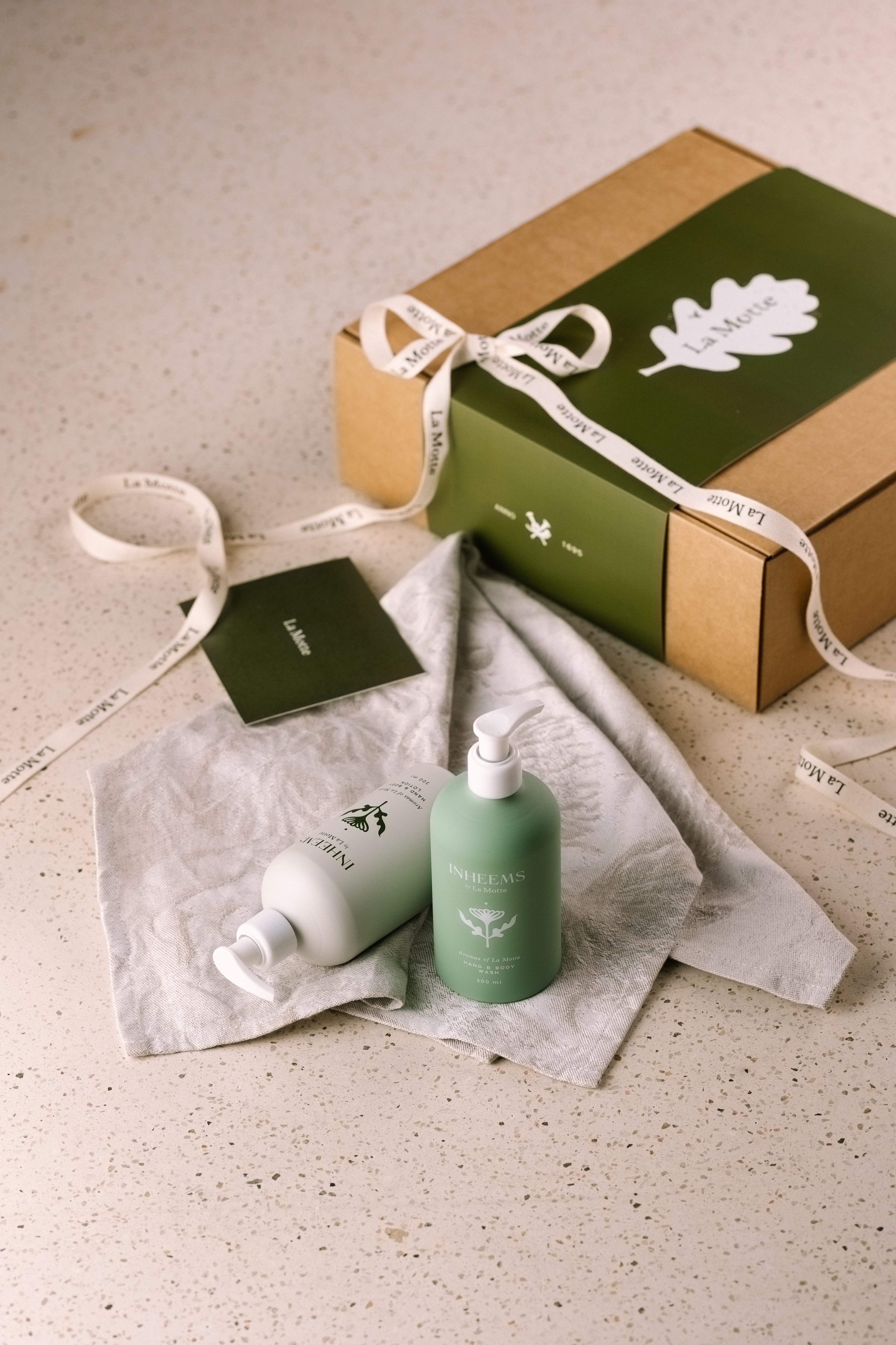 La Motte Inheems Hand & Body Duo Gift Box R 750.00 Hand & Body Wash - A gentle natural liquid soap cleansing while protecting the skin. Enriched with grapeseed oil, panthenol and aloe, this rich, naturally preserved foaming wash cleanses softly and effectively. Hand & Body Lotion - Formulated to nourish, protect and hydrate, this hand and body lotion strengthen the skin's barrier by creating a breathable layer locking in moisture, extending hydrations and calming redness. Naturally preserved. Extracts of buchu, rooibos, honeybush and Cape aloe. Fragranced with indigenous essential oils that embody die aromas of La Motte.