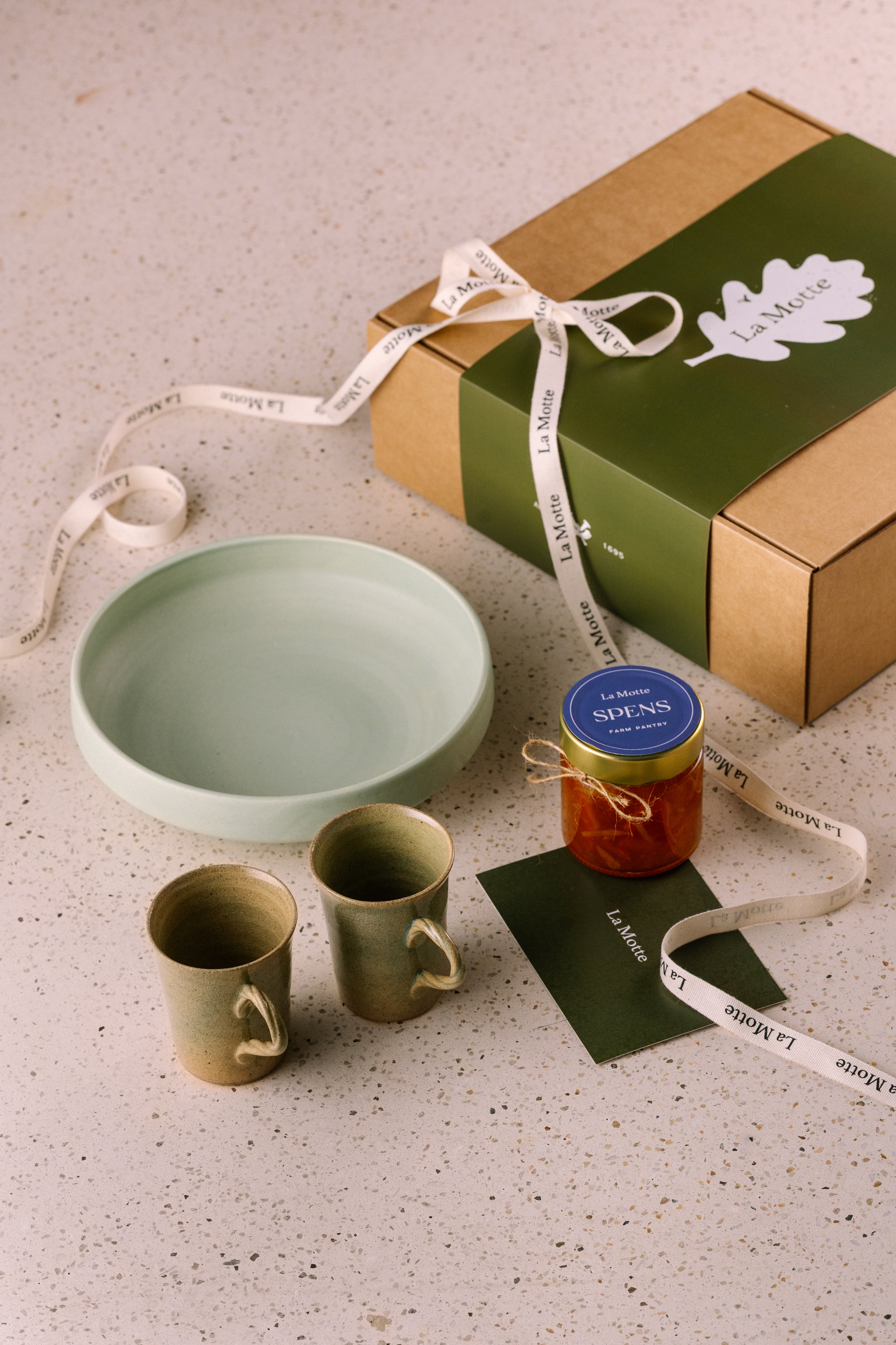 La Motte The Breakfast Box R1,331.00 Start your day in style! Two elegant mugs with twisted handles for coffee or tea, an edge bowl for rusks or toast and a jar of preserve from the farm pantry. Beautifully packaged with a card to sign